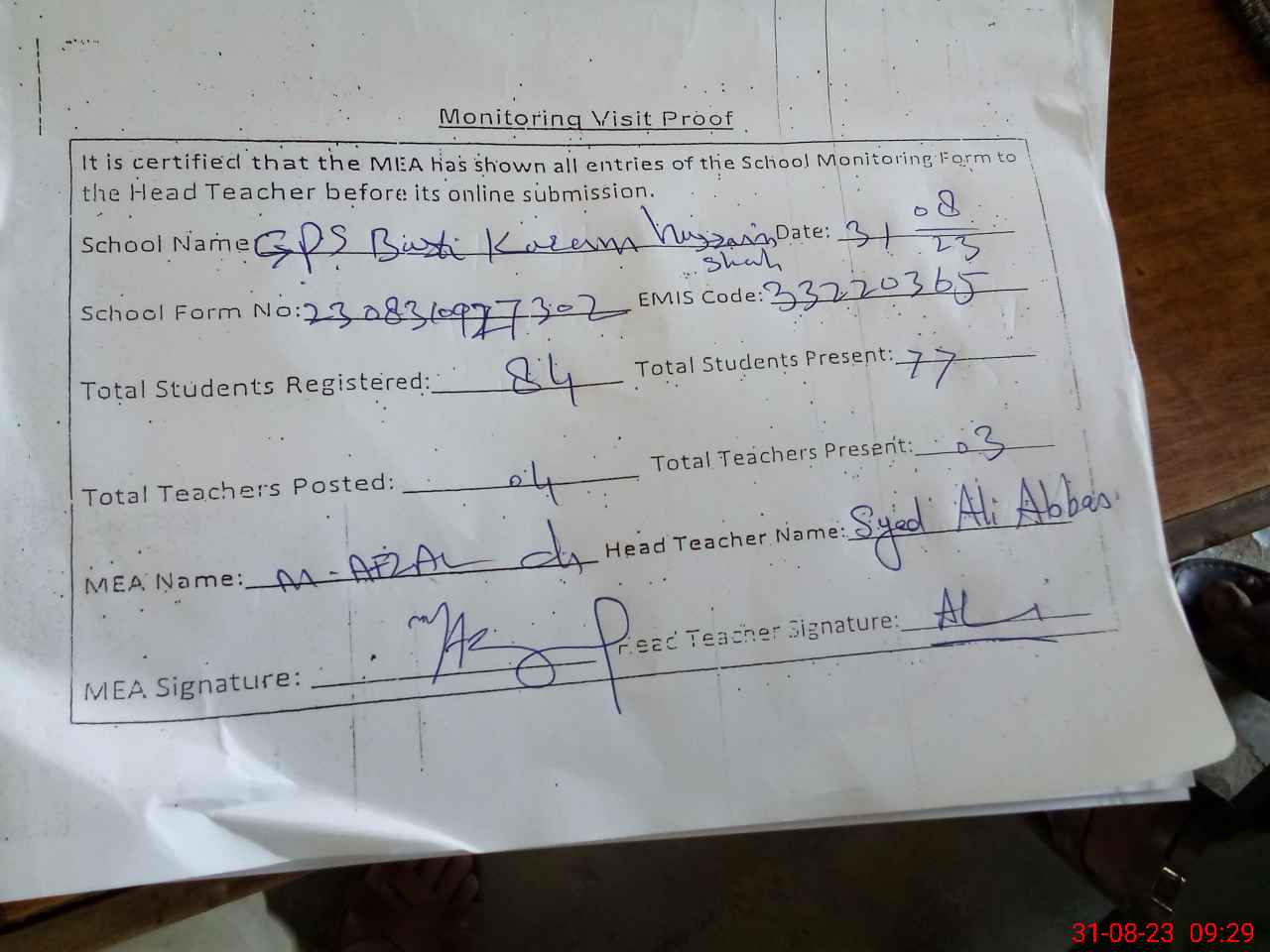 | Attendance Register | Head Teacher | MEA with School | Visit Proof |
