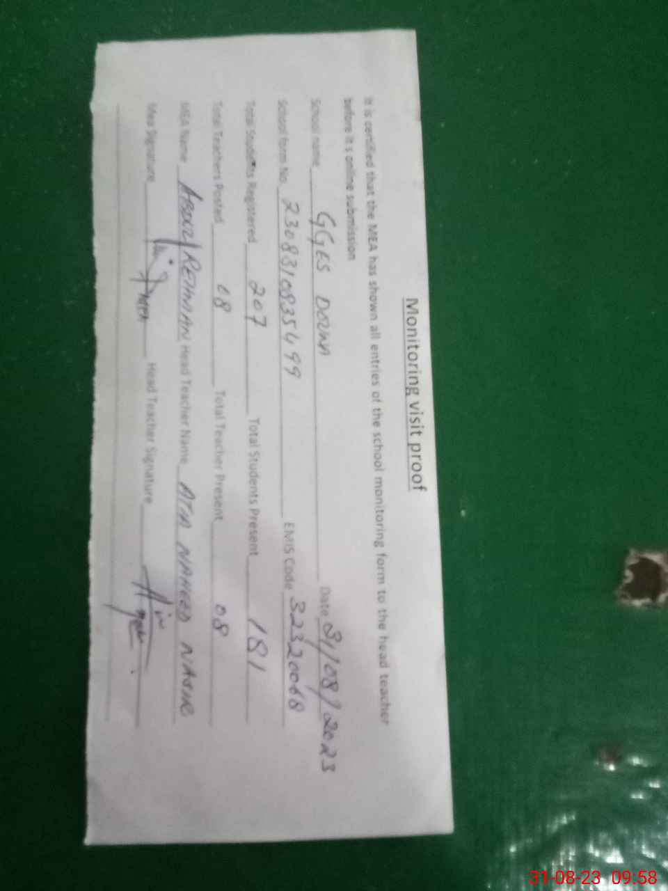 | Attendance Register | Head Teacher | MEA with School | Visit Proof |