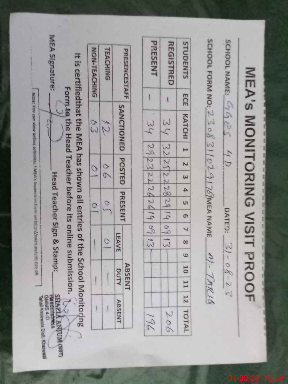 | Attendance Register | Head Teacher | MEA with School | Visit Proof |