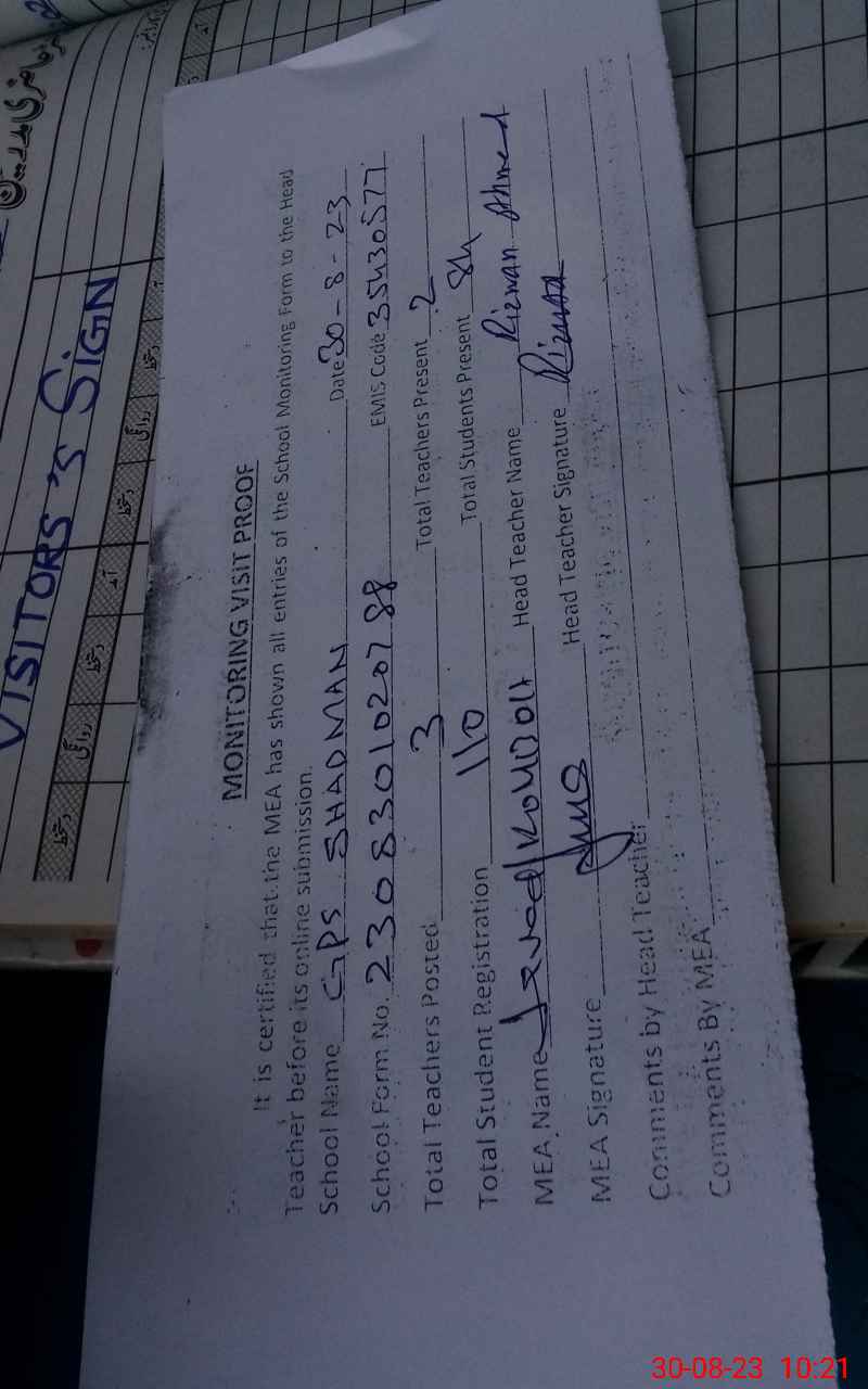 | Attendance Register | Head Teacher | MEA with School | Visit Proof |