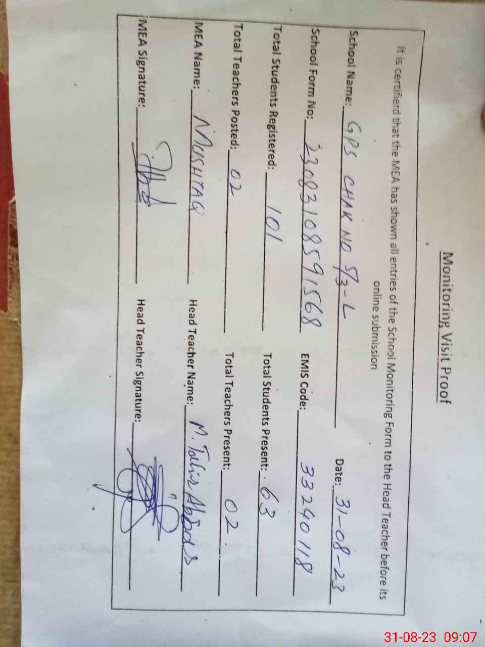 | Attendance Register | Head Teacher | MEA with School | Visit Proof |