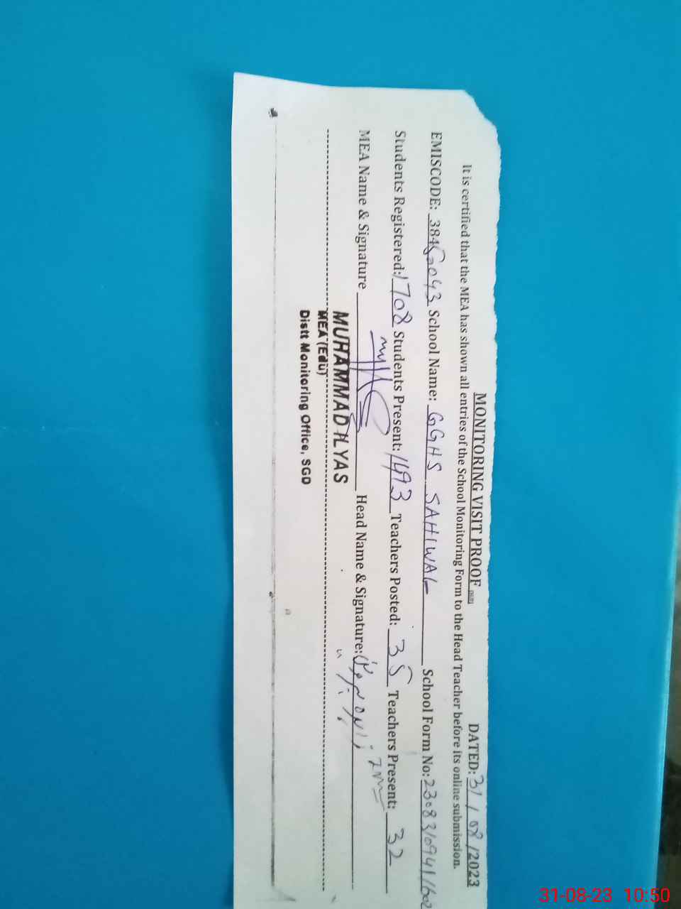 | EMIS Code: 38450043 | Name of School: GGHS SAHIWAL | |||