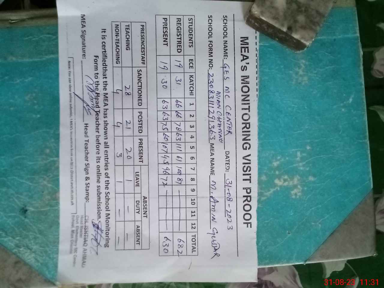 | Attendance Register | Head Teacher | MEA with School | Visit Proof |
