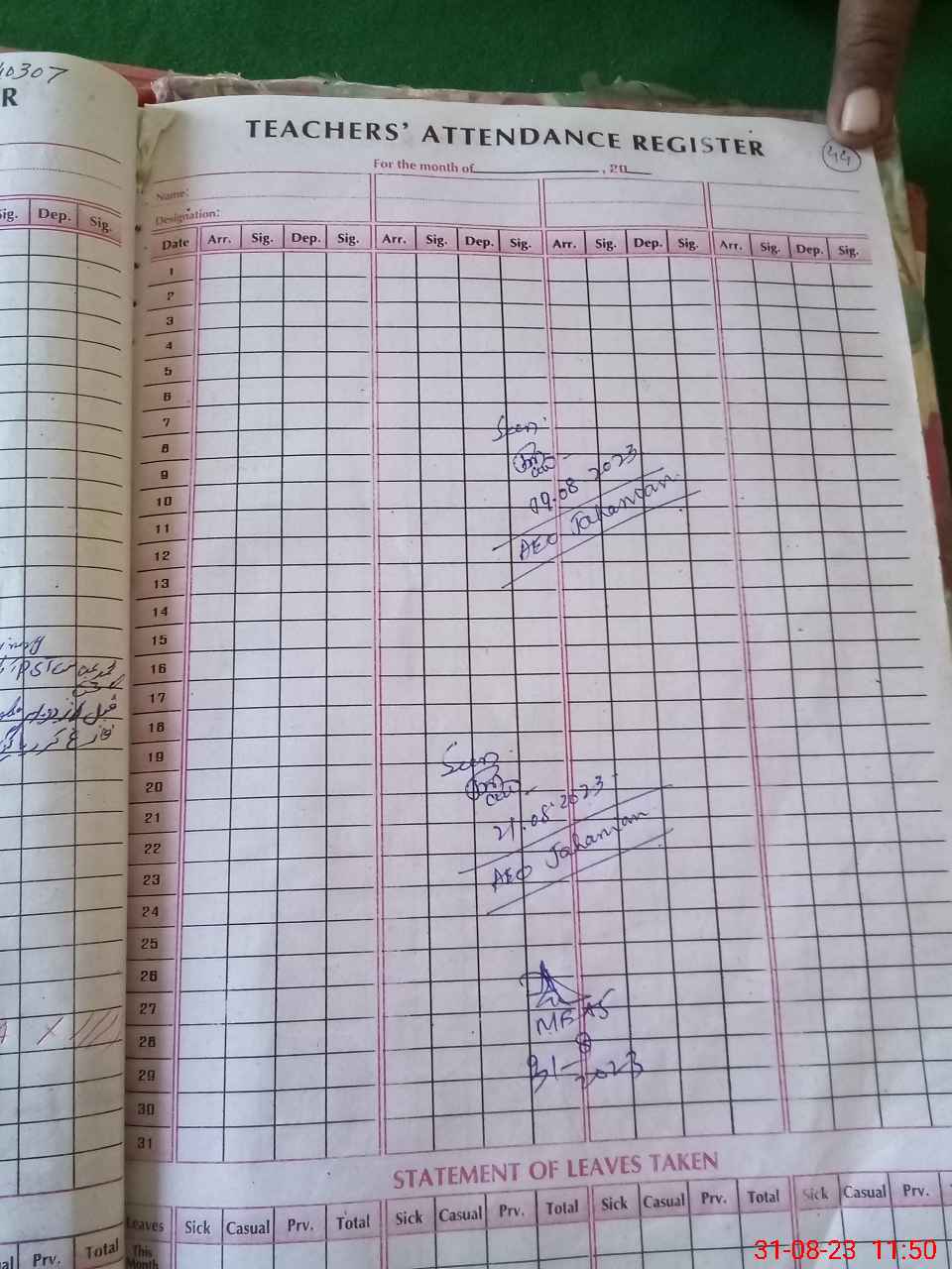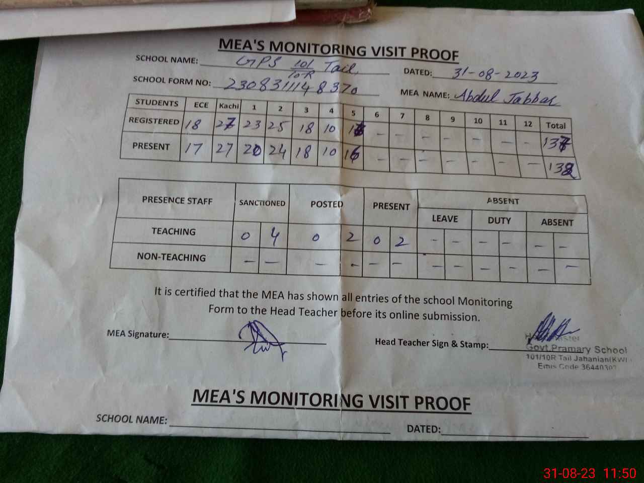| Attendance Register | Head Teacher | MEA with School | Visit Proof |