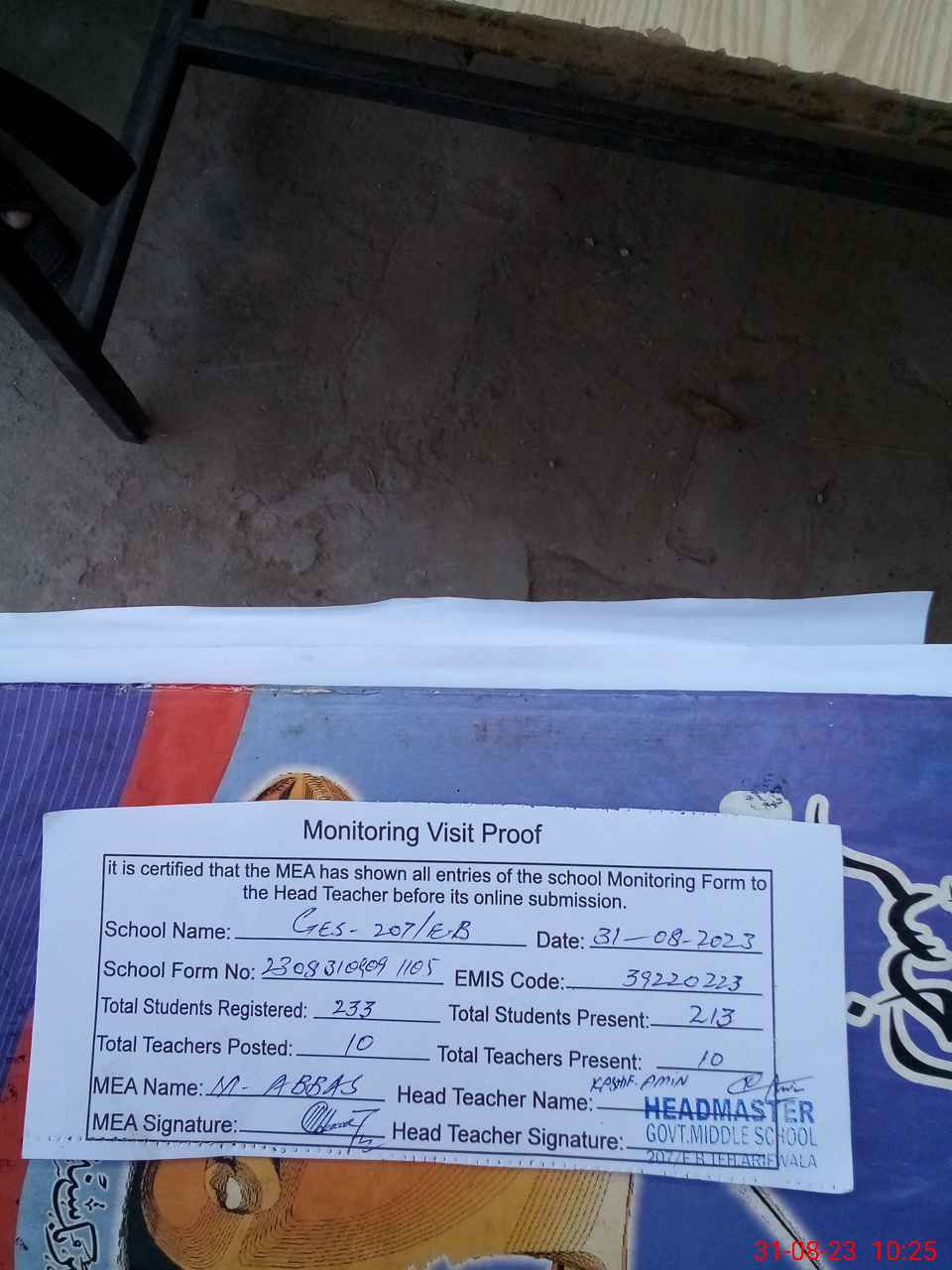 | Attendance Register | Head Teacher | MEA with School | Visit Proof |