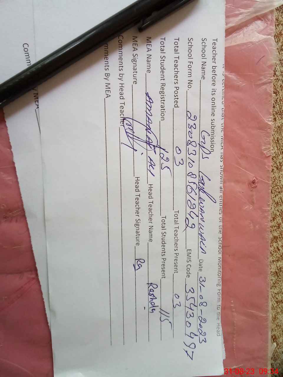 | Attendance Register | Head Teacher | MEA with School | Visit Proof |