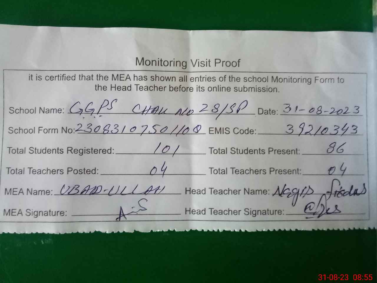 | Attendance Register | Head Teacher | MEA with School | Visit Proof |
