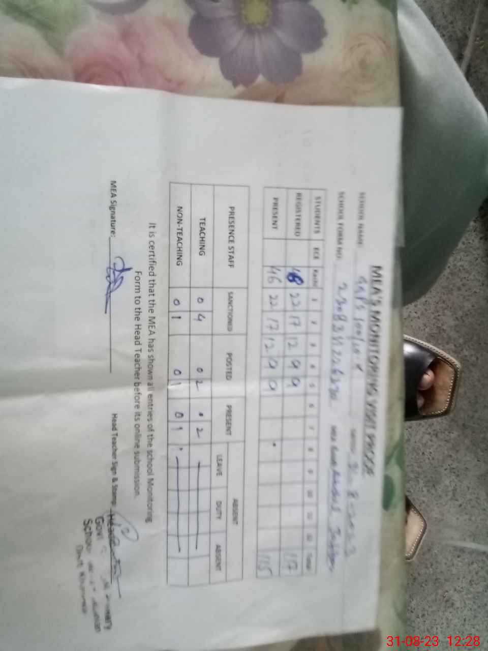 | Attendance Register | Head Teacher | MEA with School | Visit Proof |