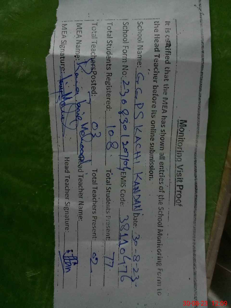 | Attendance Register | Head Teacher | MEA with School | Visit Proof |