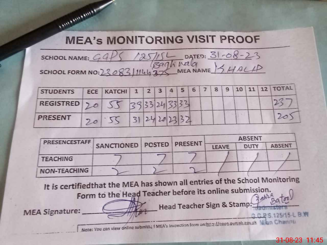 | Attendance Register | Head Teacher | MEA with School | Visit Proof |