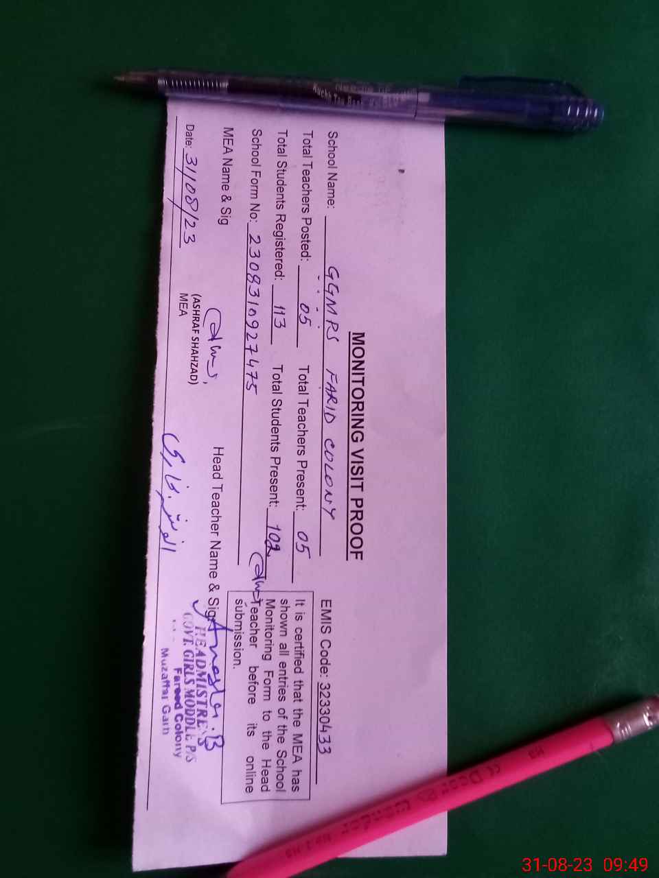 | Attendance Register | Head Teacher | MEA with School | Visit Proof |
