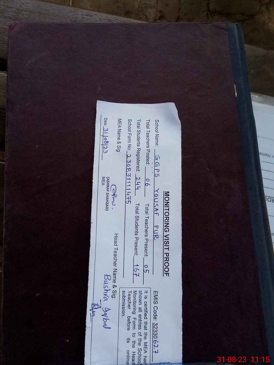 | Attendance Register | Head Teacher | MEA with School | Visit Proof |