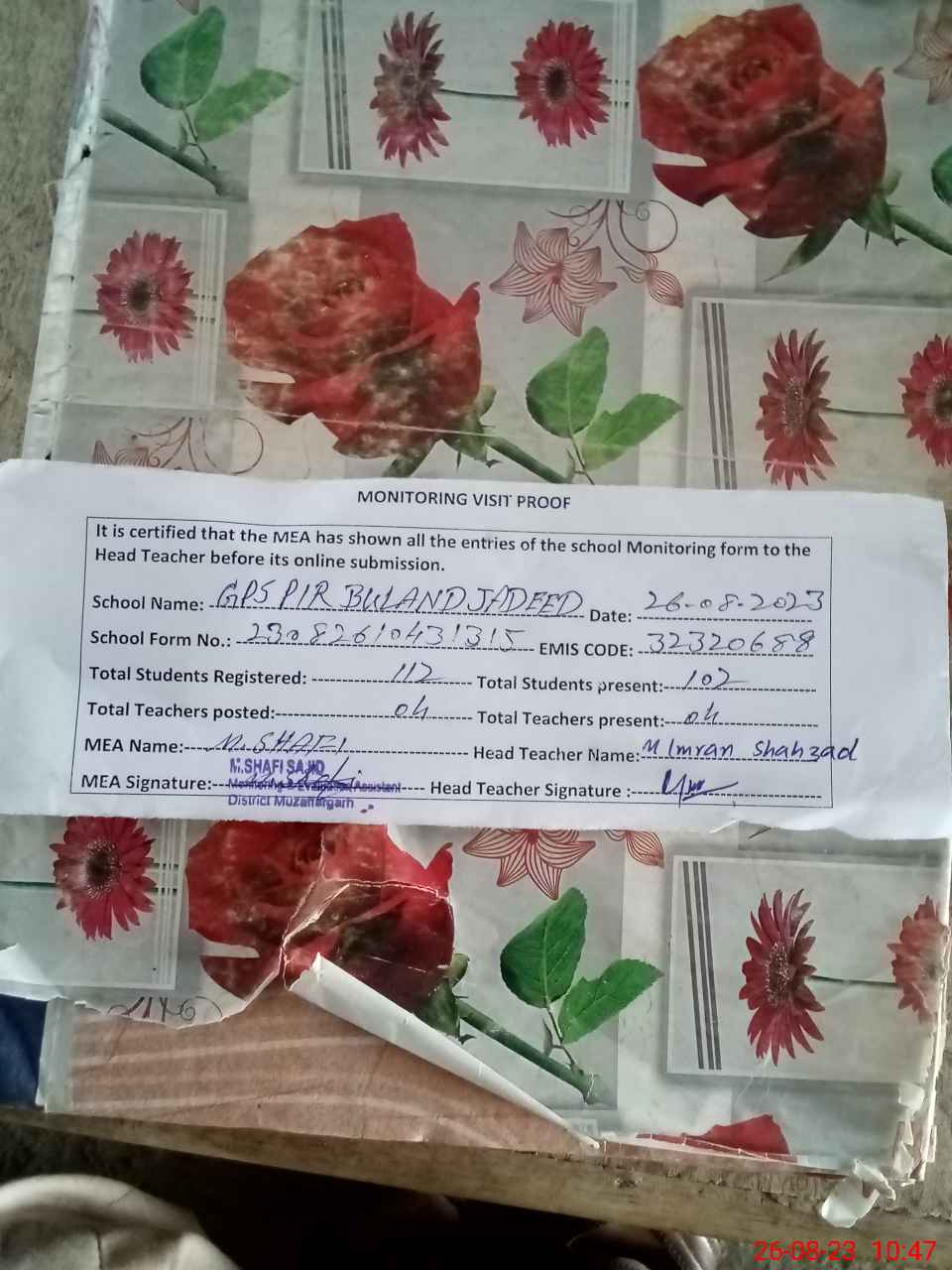 | Attendance Register | Head Teacher | MEA with School | Visit Proof |