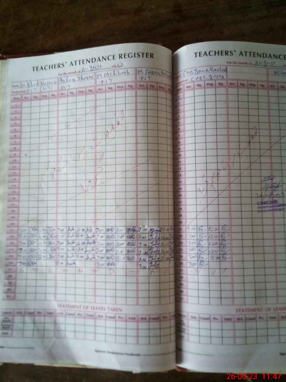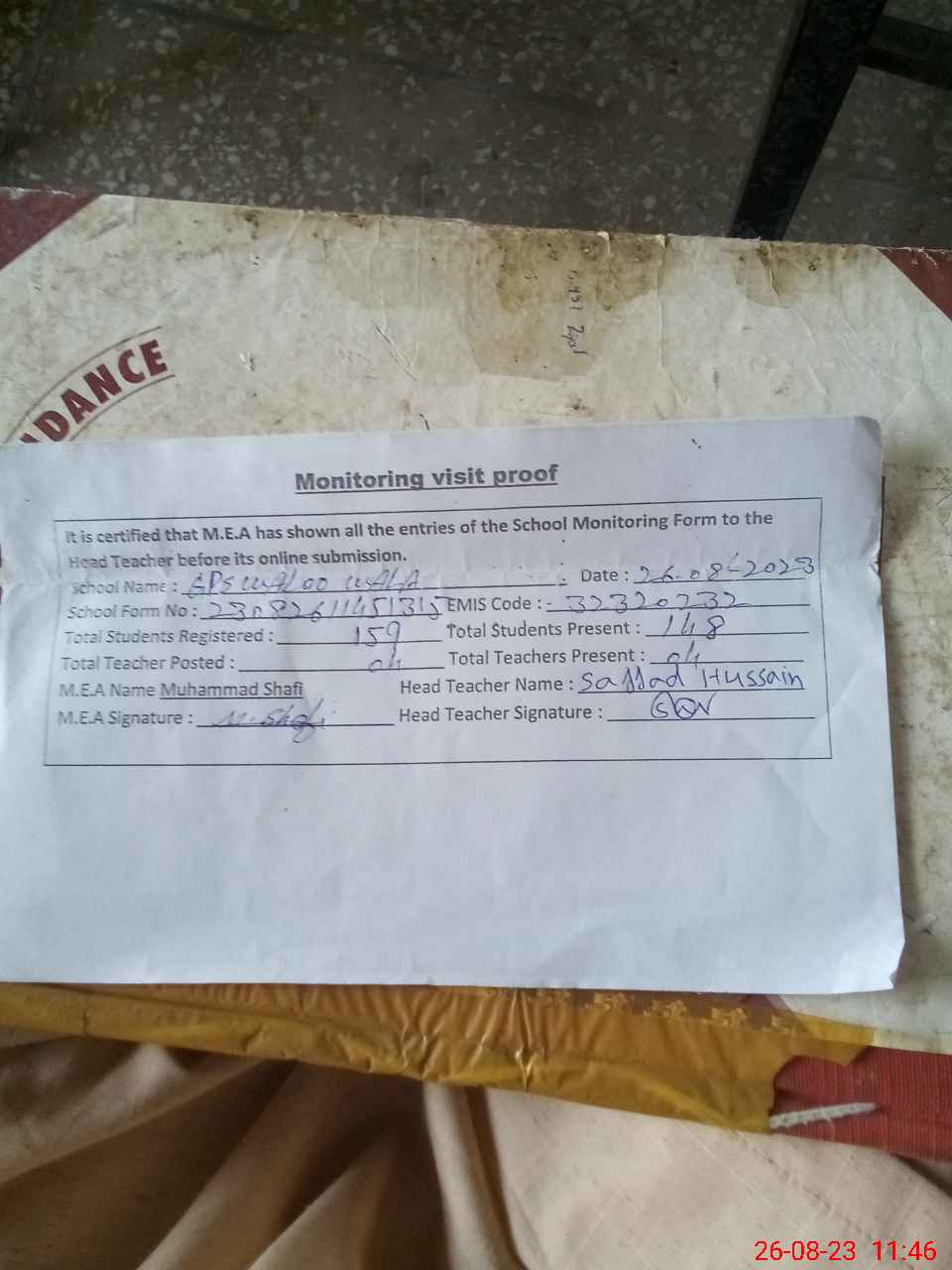 | Attendance Register | Head Teacher | MEA with School | Visit Proof |