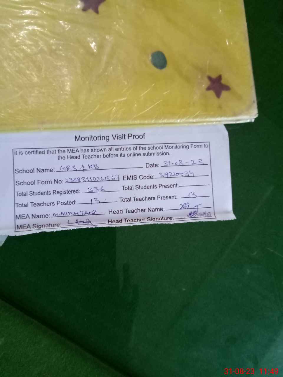 | Attendance Register | Head Teacher | MEA with School | Visit Proof |