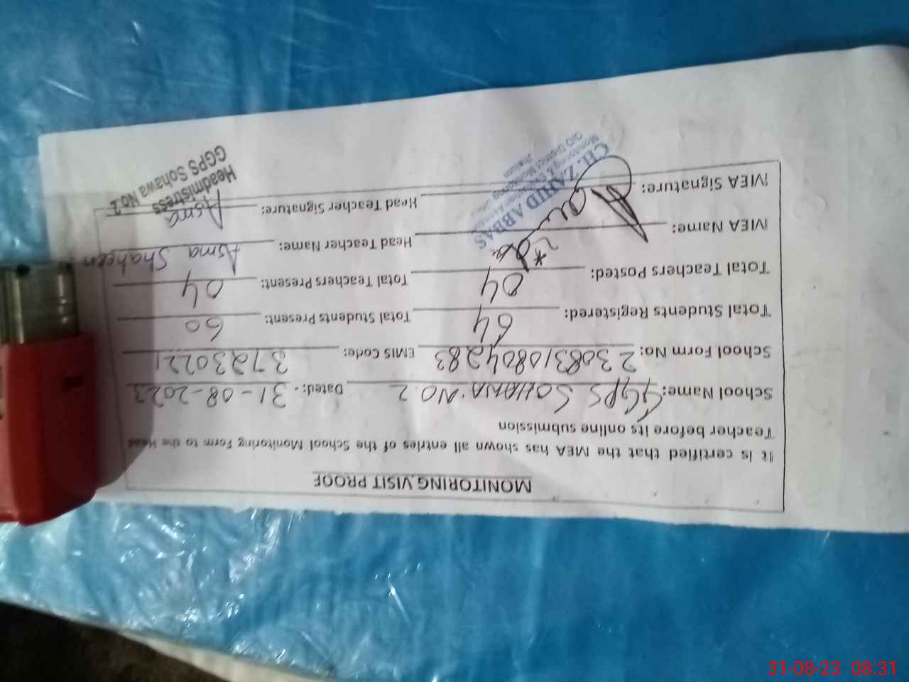 | Monitoring Date: 31-08-2023 | Start Time: 31-08-2023 08:04 AM | End Time: 31-08-2023 08:33 AM | Name of MEA: Za**** Ab**** | |