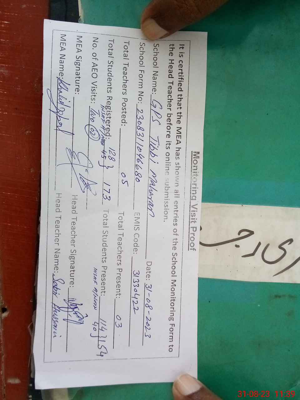 | Remarks (Use Separate Page if Required): Class verification is not updated on MEA tab as per sis and one class is sitting in veranda and two classes are sitting on open air and school has insaf after noon classes with students strength 45 | |||||