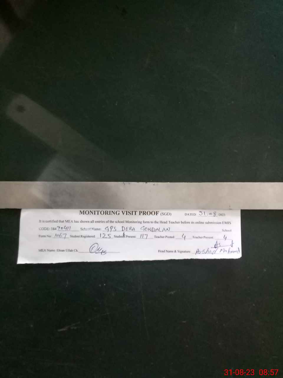 | Attendance Register | Head Teacher | MEA with School | Visit Proof |