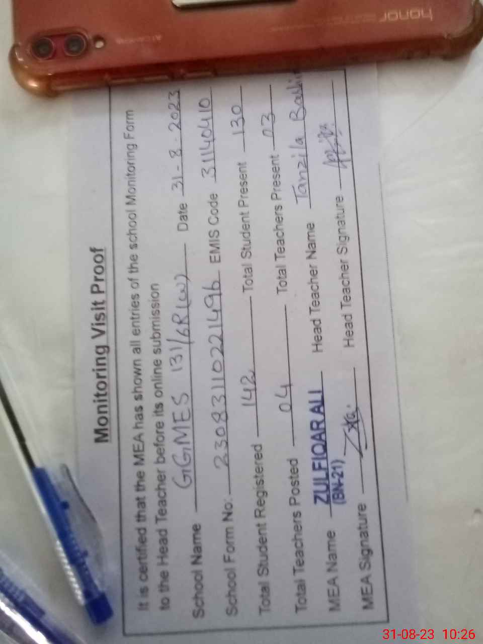 | Attendance Register | Head Teacher | MEA with School | Visit Proof |