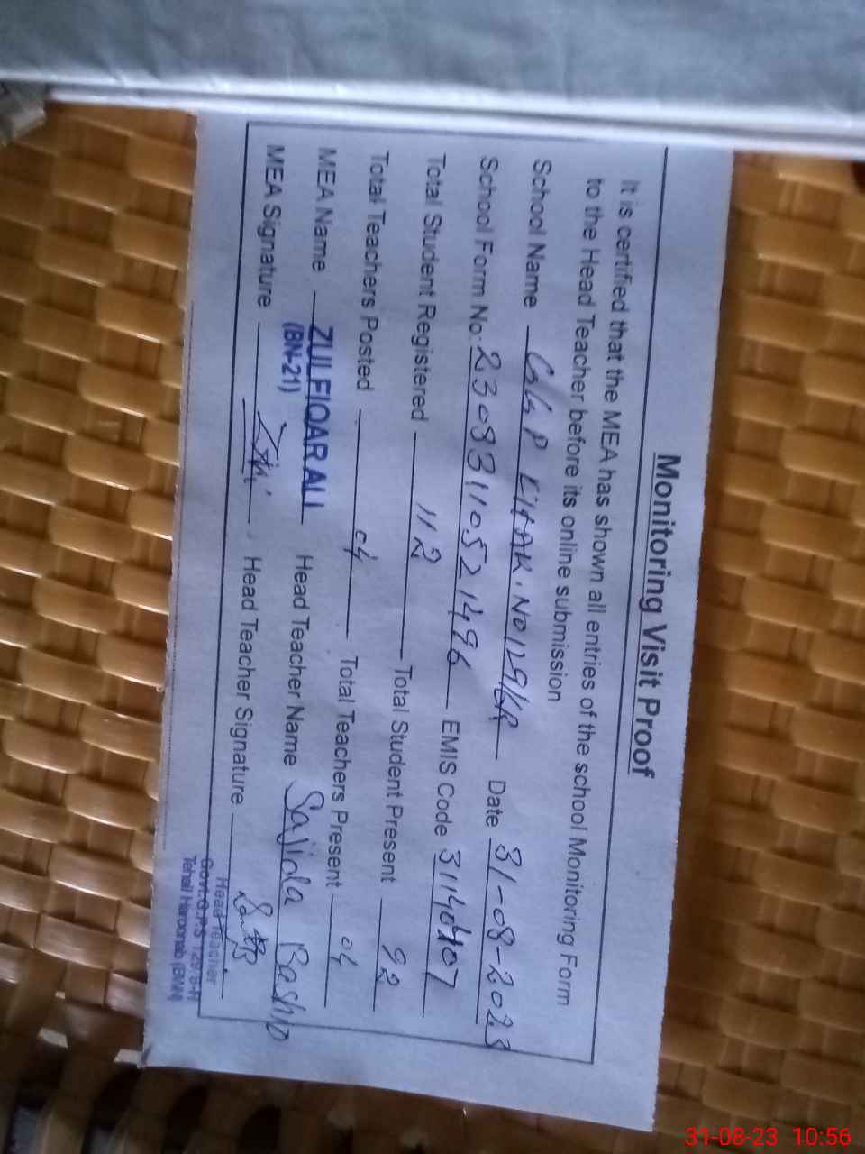 | Attendance Register | Head Teacher | MEA with School | Visit Proof |