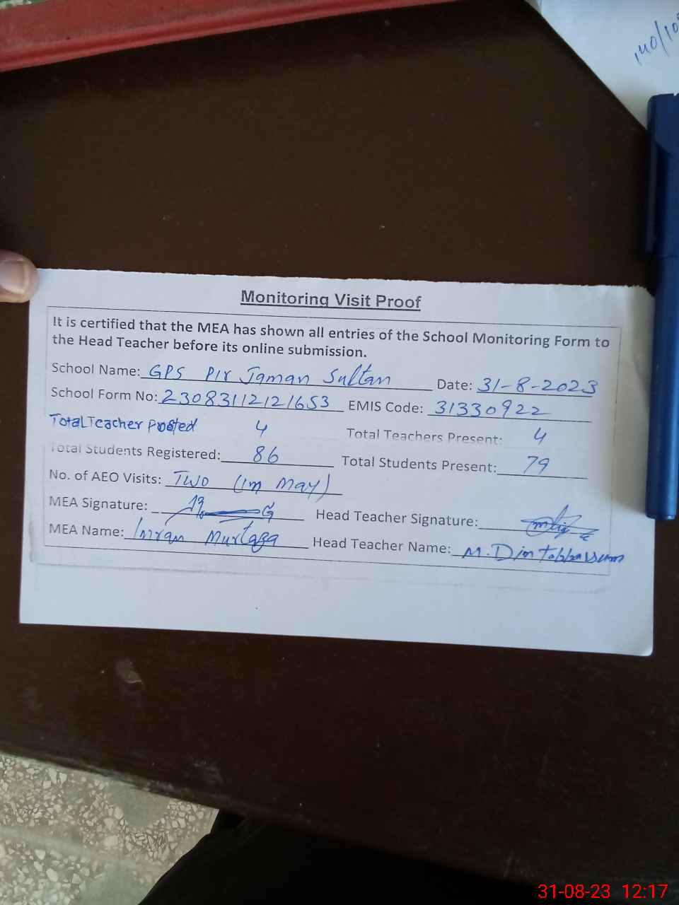 | Attendance Register | Head Teacher | MEA with School | Visit Proof |