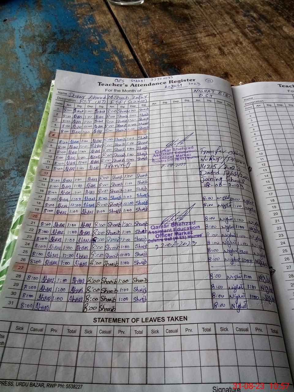 | CNIC | Full Name | Designation | R/C | Absence During Last Calender Month |
