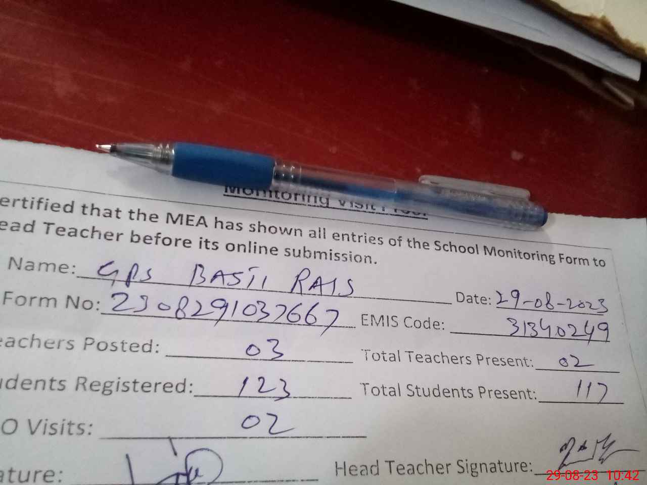 | Attendance Register | Head Teacher | MEA with School | Visit Proof |