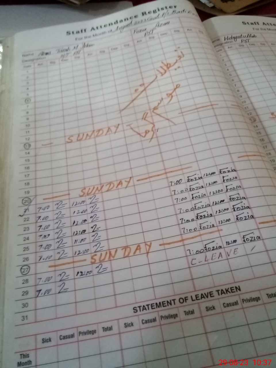 | CNIC | Full Name | Designation | R/C | Absence During Last Calender Month |