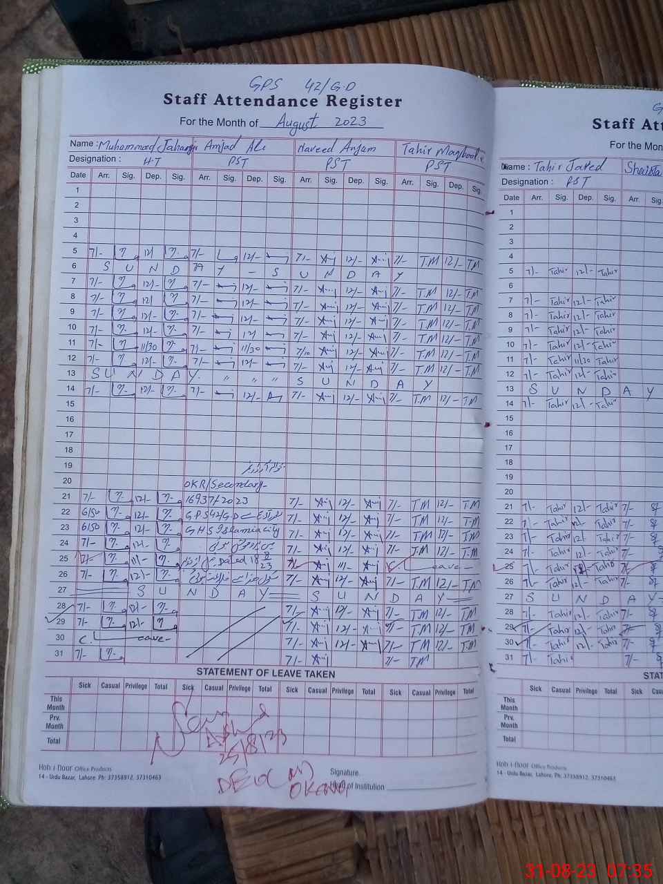 | CNIC | Full Name | Designation | R/C | Absence During Last Calender Month |