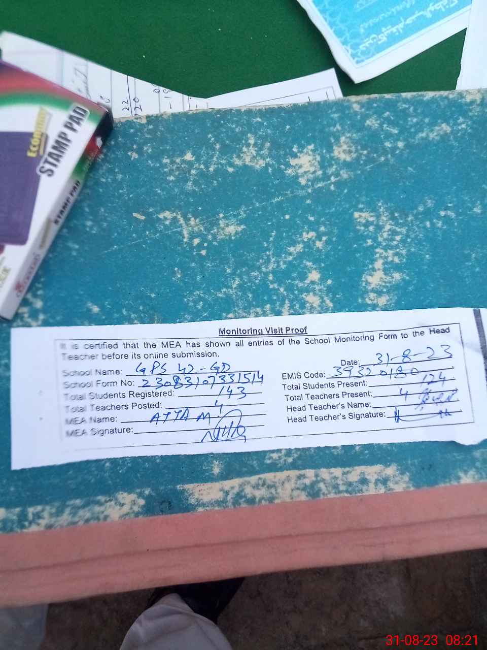 | Attendance Register | Head Teacher | MEA with School | Visit Proof |
