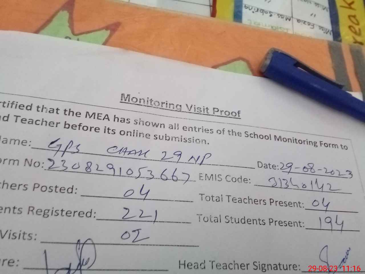 | Attendance Register | Head Teacher | MEA with School | Visit Proof |