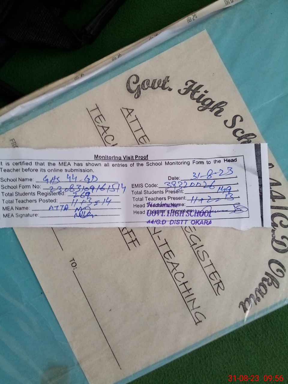 | Attendance Register | Head Teacher | MEA with School | Visit Proof |