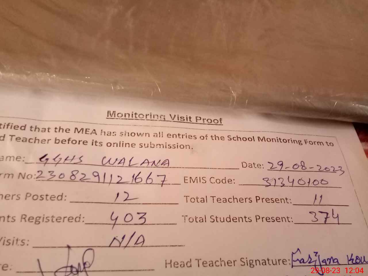 | Attendance Register | Head Teacher | MEA with School | Visit Proof |