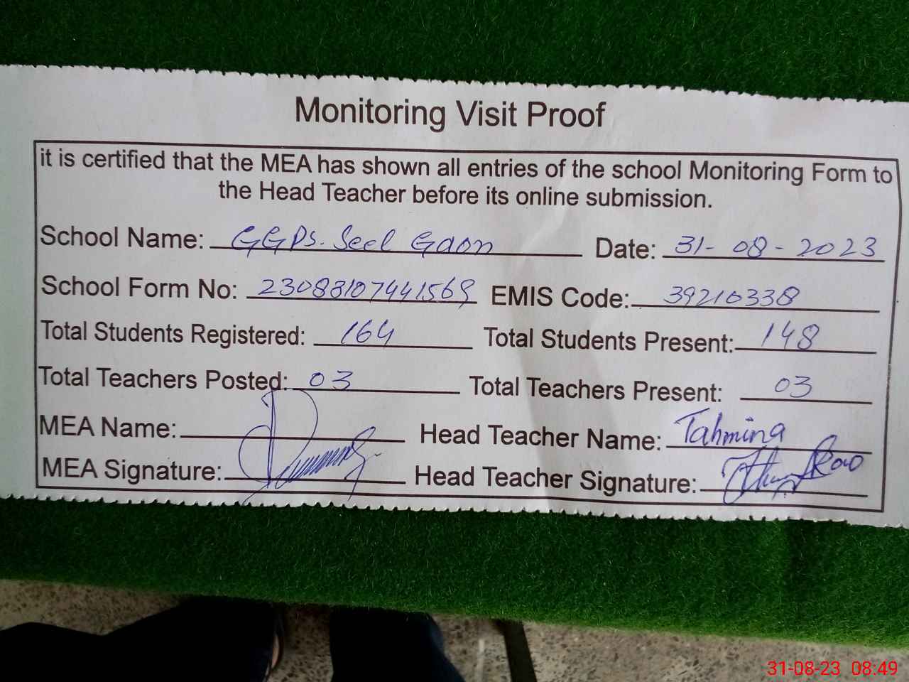 | Attendance Register | Head Teacher | MEA with School | Visit Proof |