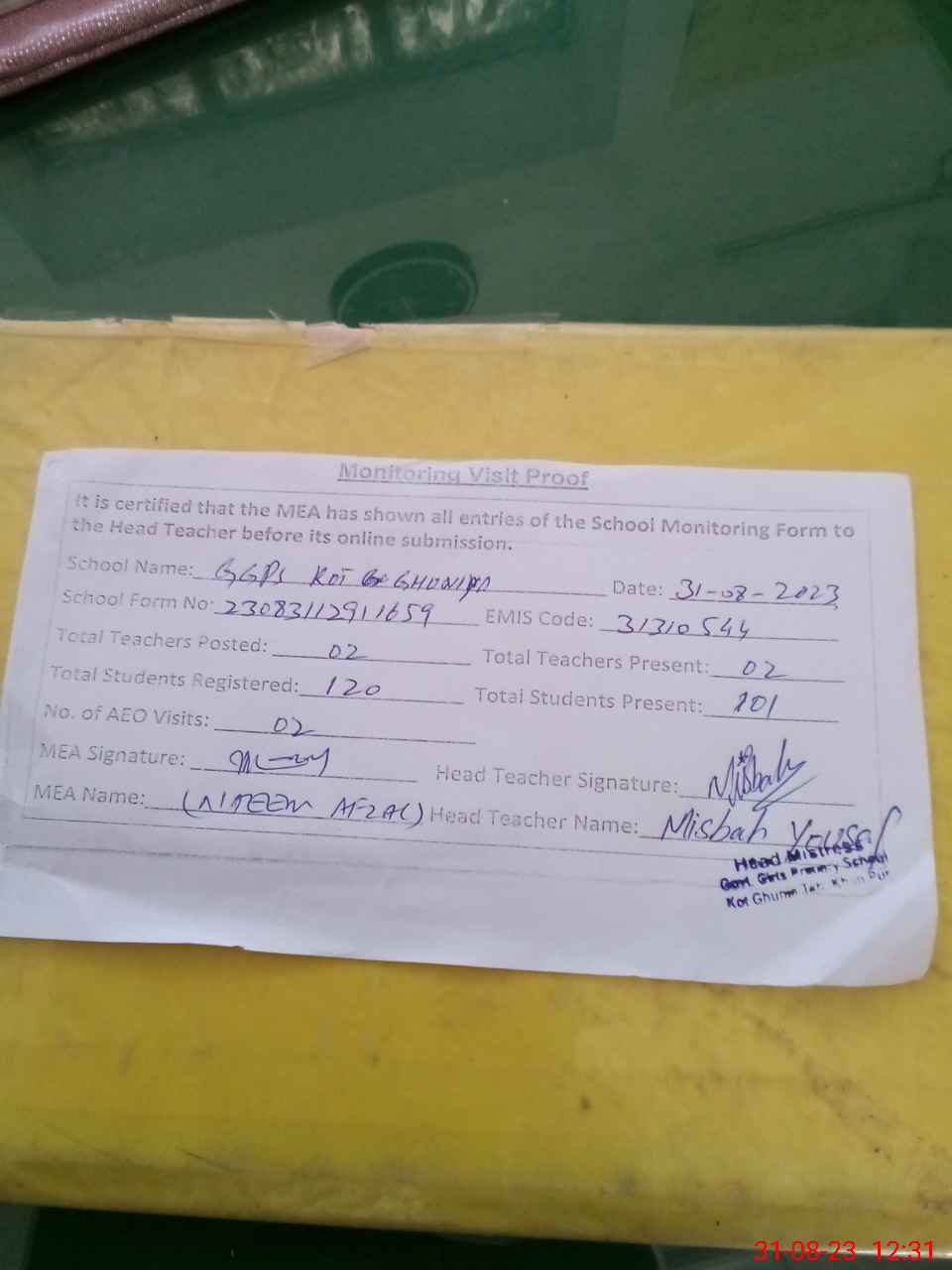 | Attendance Register | Head Teacher | MEA with School | Visit Proof |
