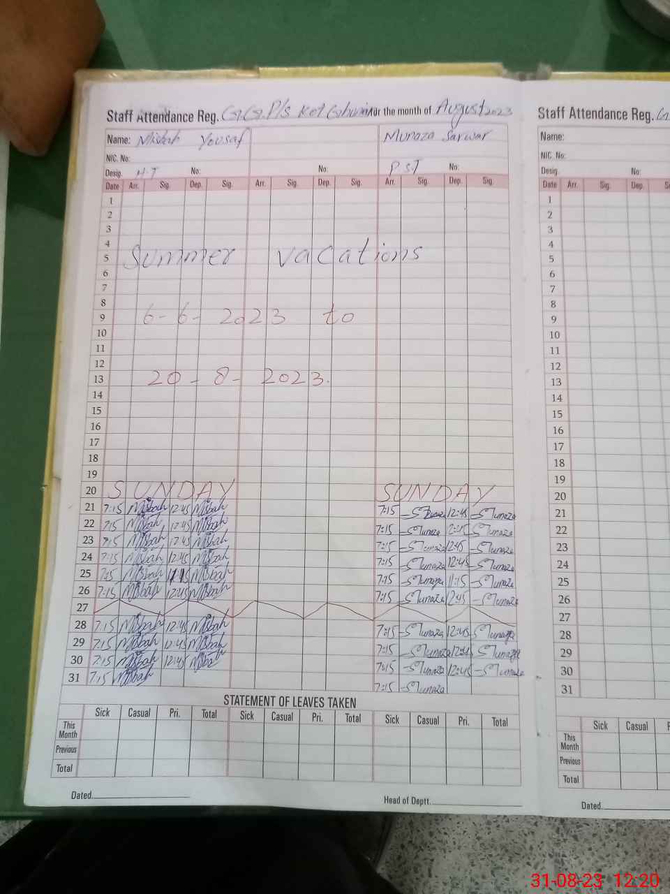 | Leave | Duty | Absent | Maternity | Medical | Ex- Pak |