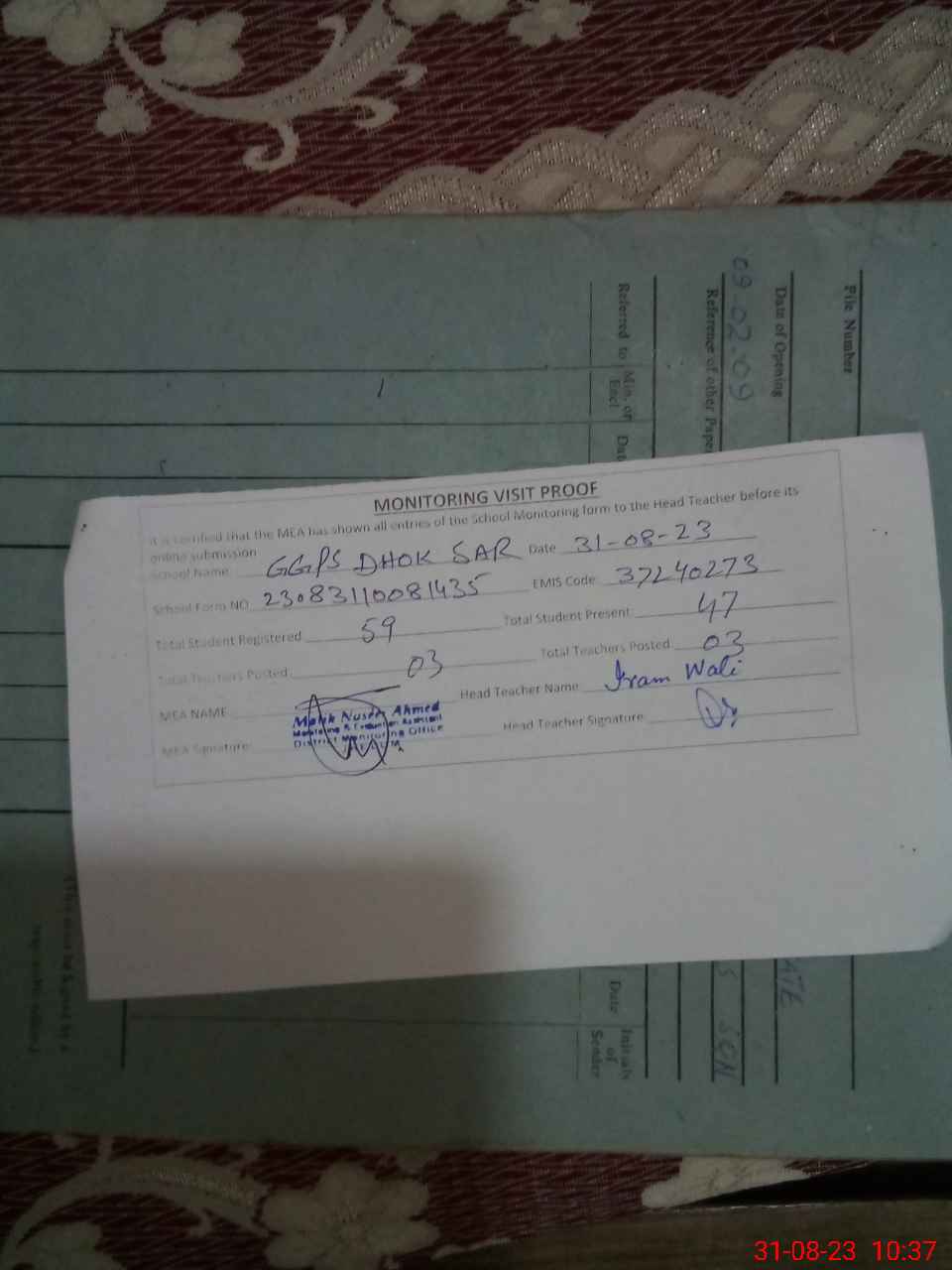 | Attendance Register | Head Teacher | MEA with School | Visit Proof |