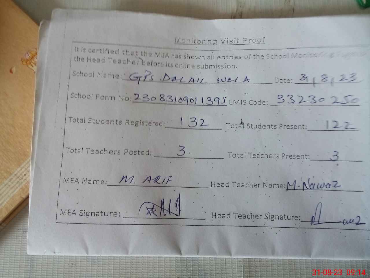 | Attendance Register | Head Teacher | MEA with School | Visit Proof |