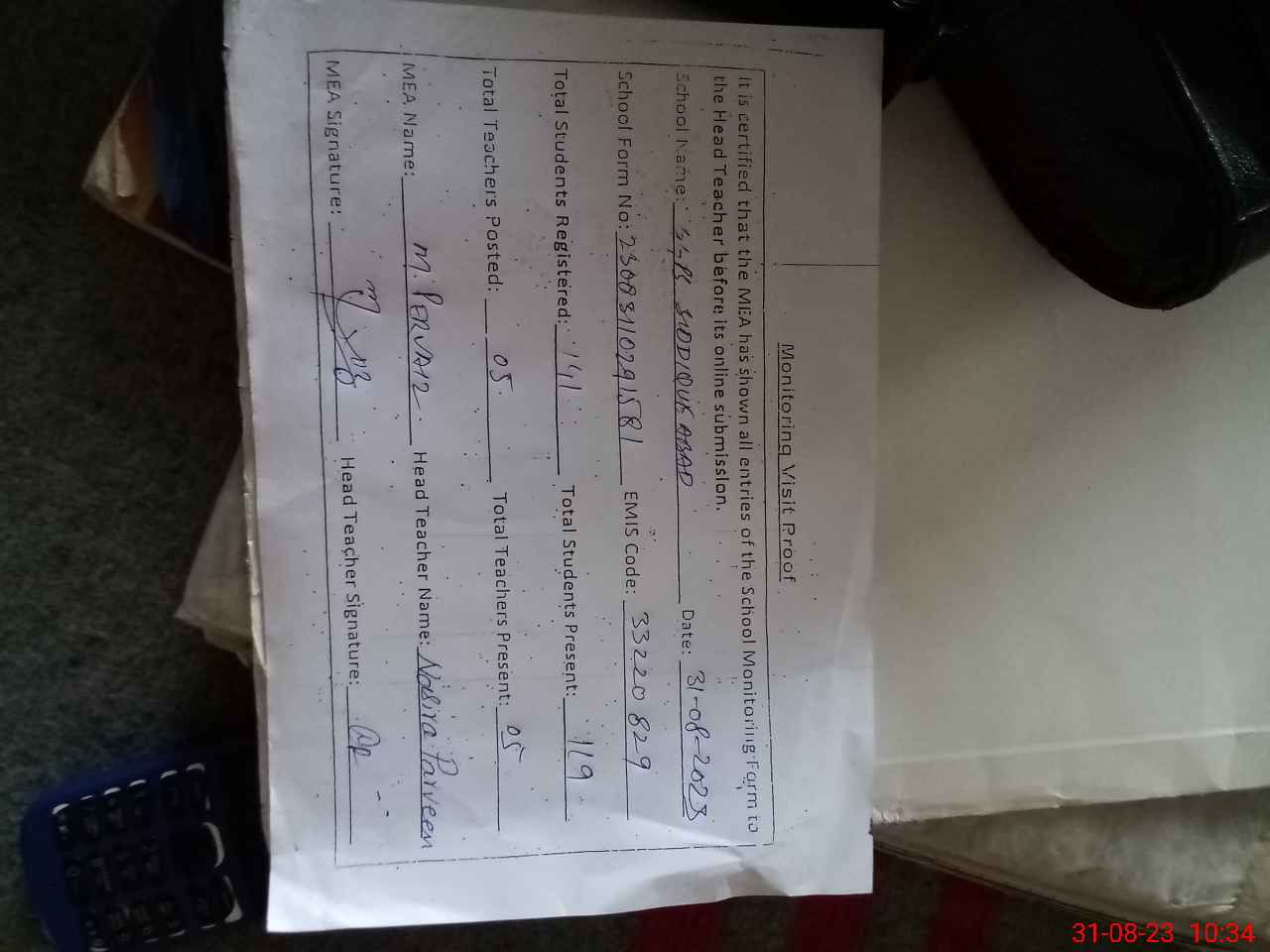 | Attendance Register | Head Teacher | MEA with School | Visit Proof |