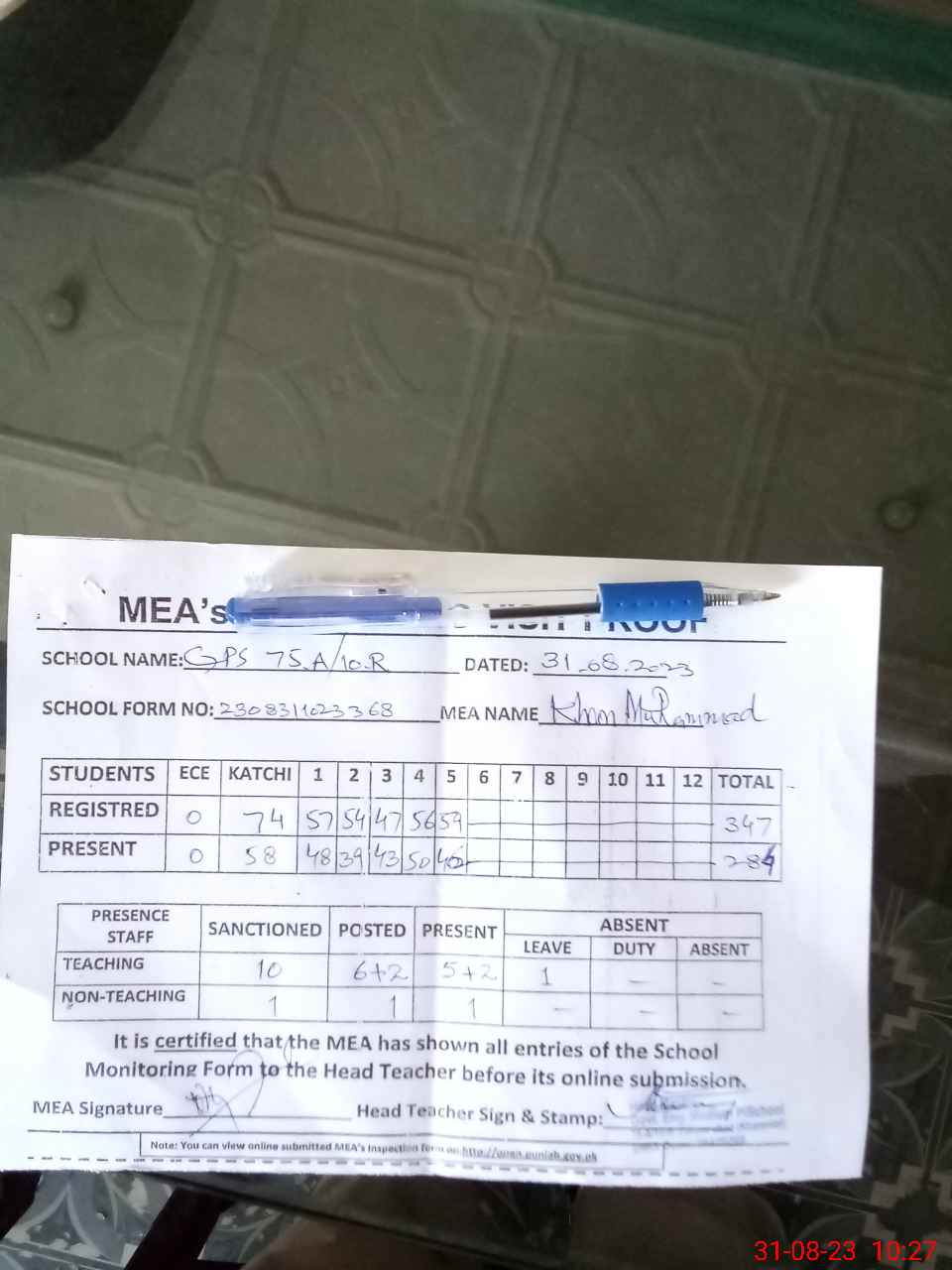 | Attendance Register | Head Teacher | MEA with School | Visit Proof |