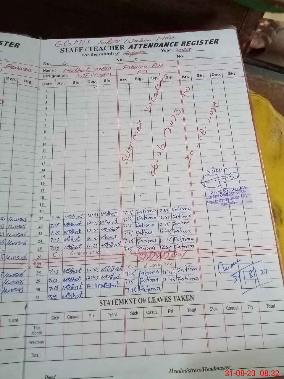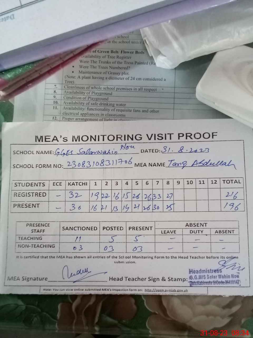 | Attendance Register | Head Teacher | MEA with School | Visit Proof |