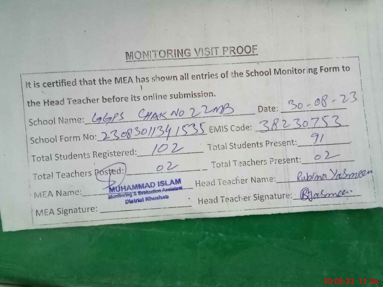 | Attendance Register | Head Teacher | MEA with School | Visit Proof |