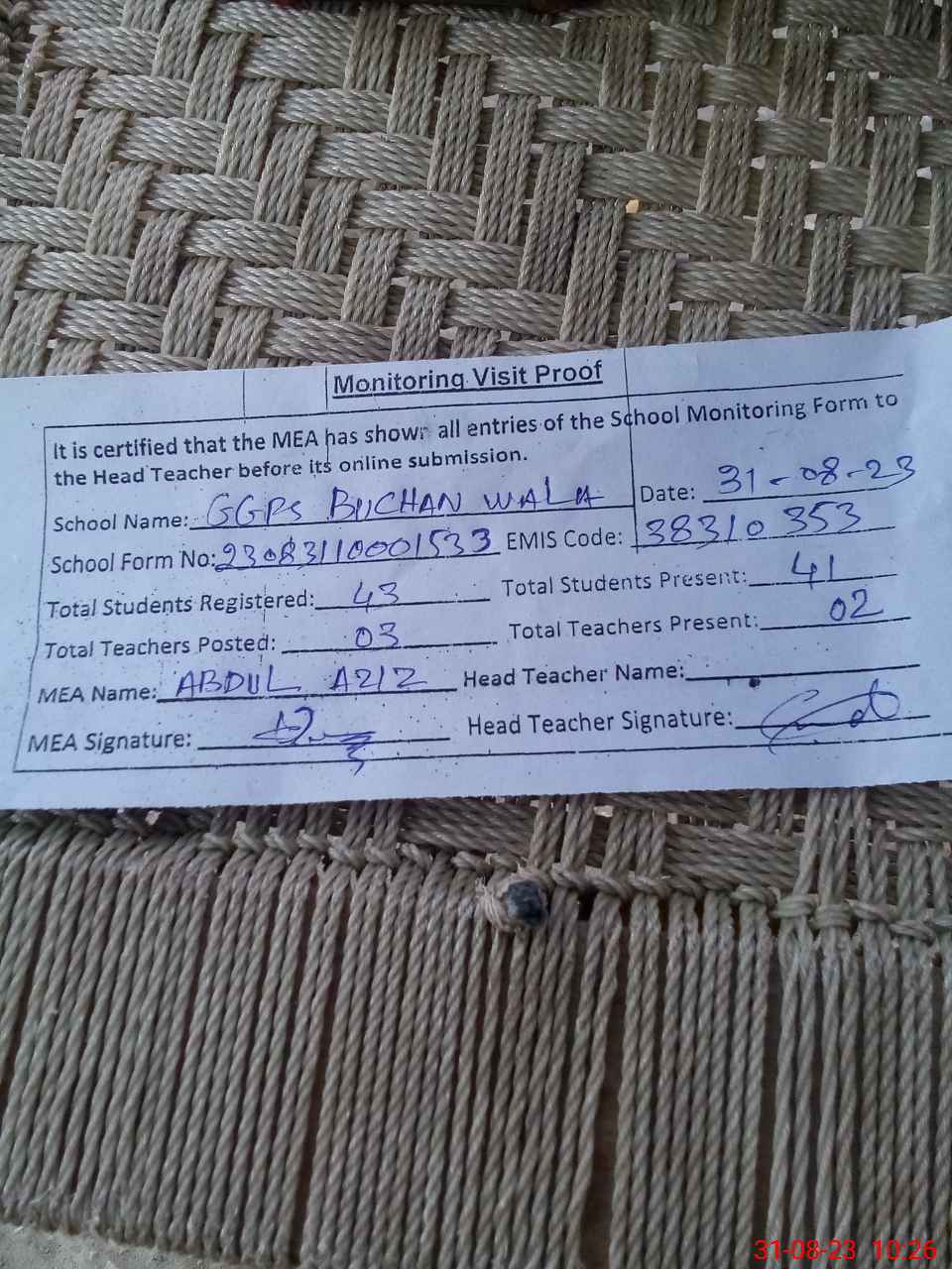 | Attendance Register | Head Teacher | MEA with School | Visit Proof |