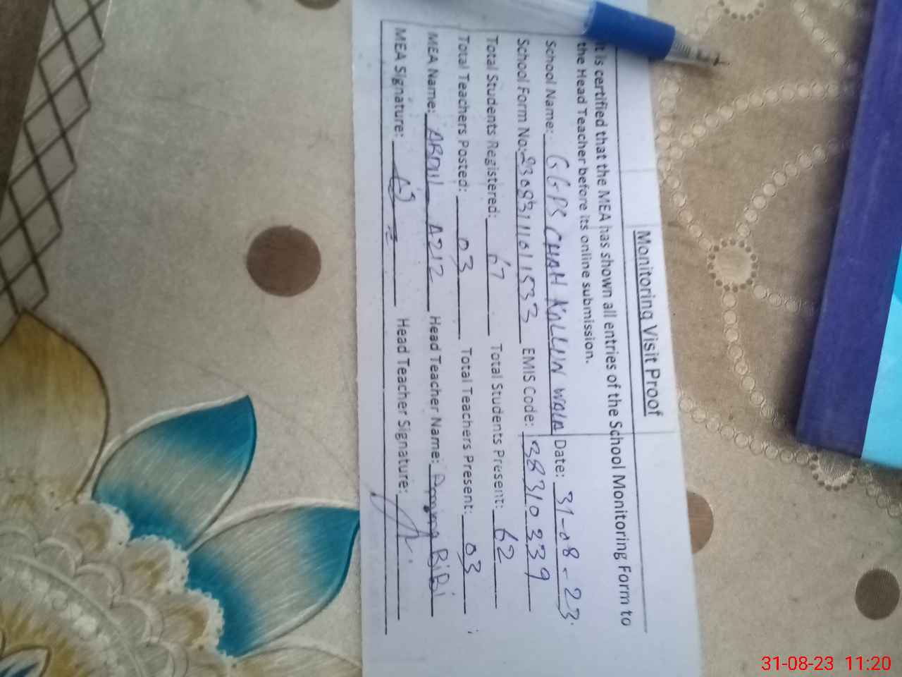 | Attendance Register | Head Teacher | MEA with School | Visit Proof |
