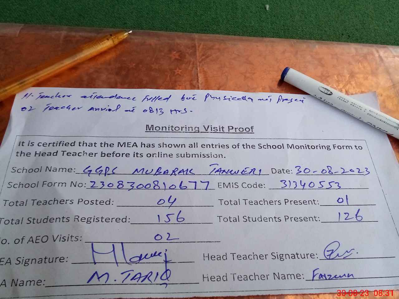 | Attendance Register | Head Teacher | MEA with School | Visit Proof |