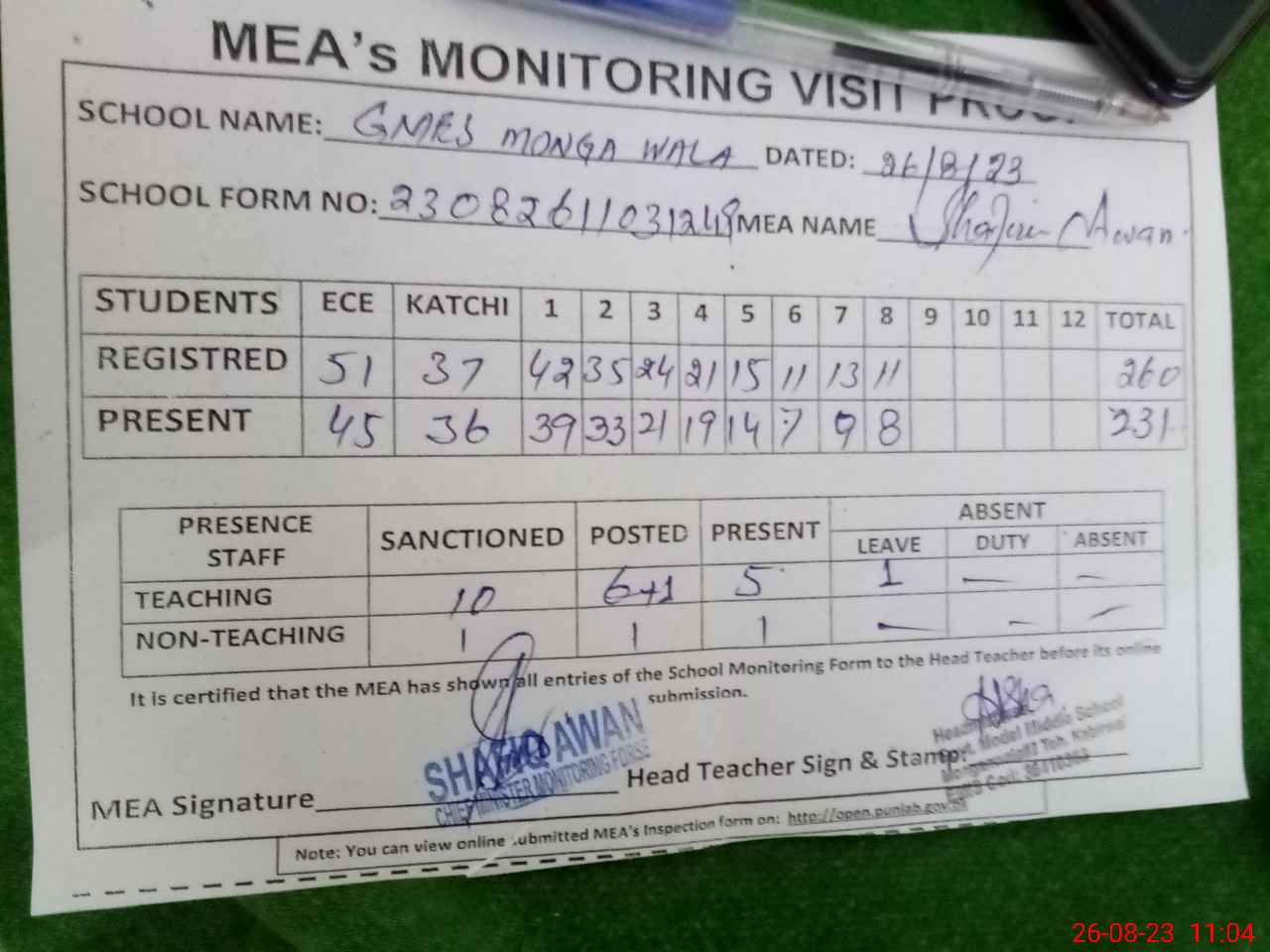 | Attendance Register | Head Teacher | MEA with School | Visit Proof |