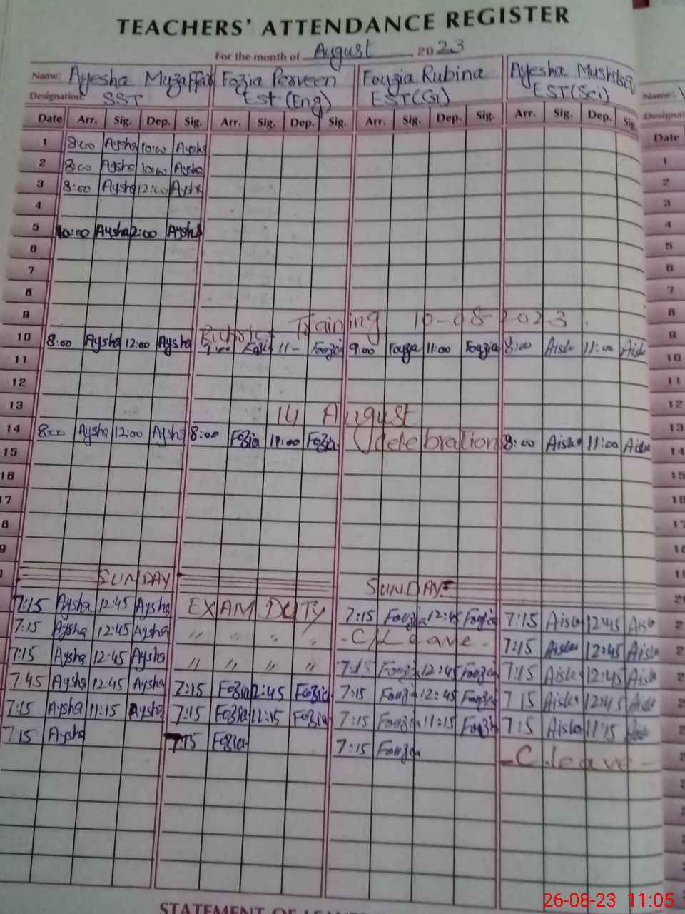 | Monitoring Date: 26-08-2023 | Start Time: 26-08-2023 10:11 AM | End Time: 26-08-2023 11:06 AM | Name of MEA: SH**** AH**** | |