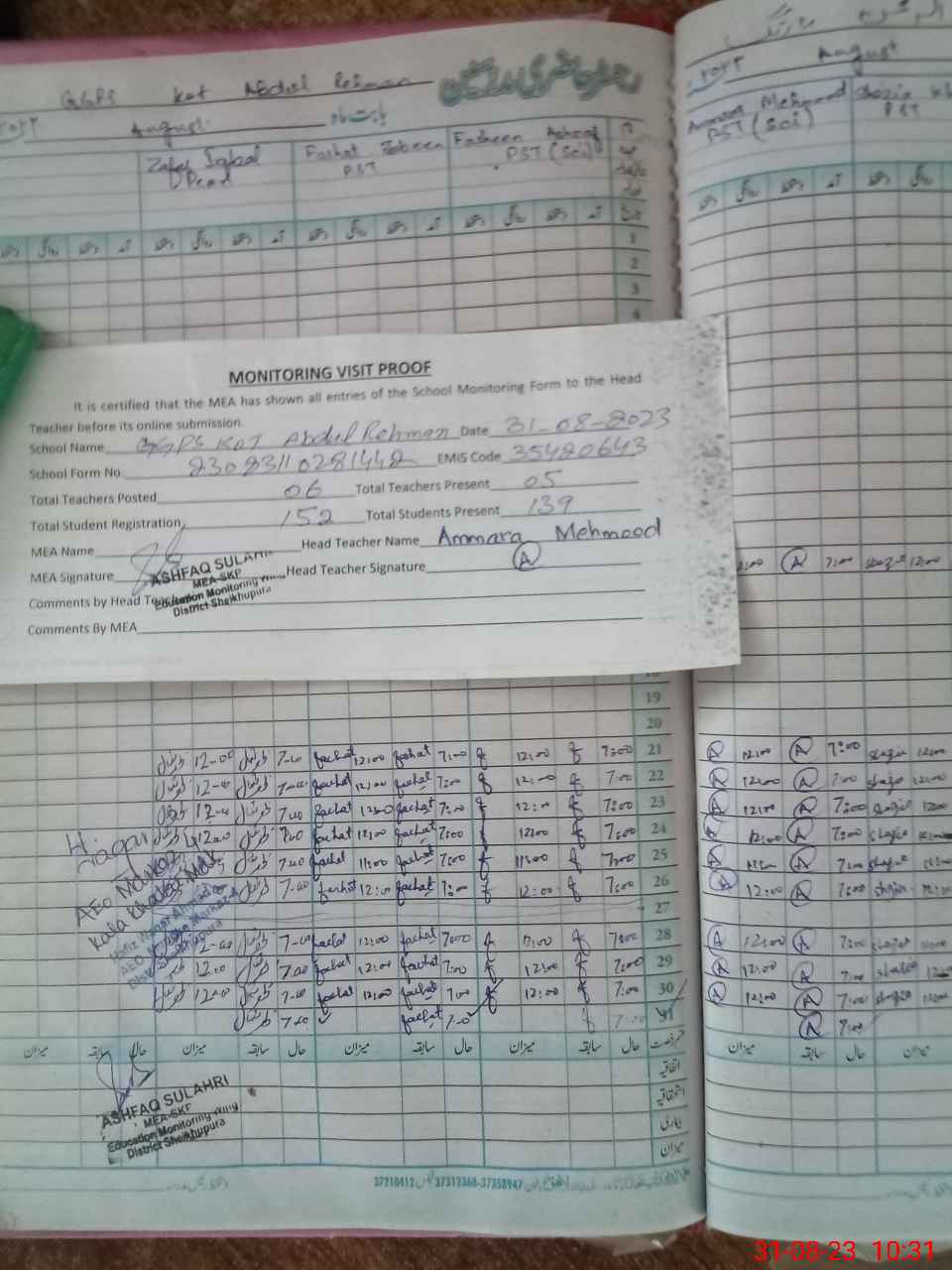 | Attendance Register | Head Teacher | MEA with School | Visit Proof |
