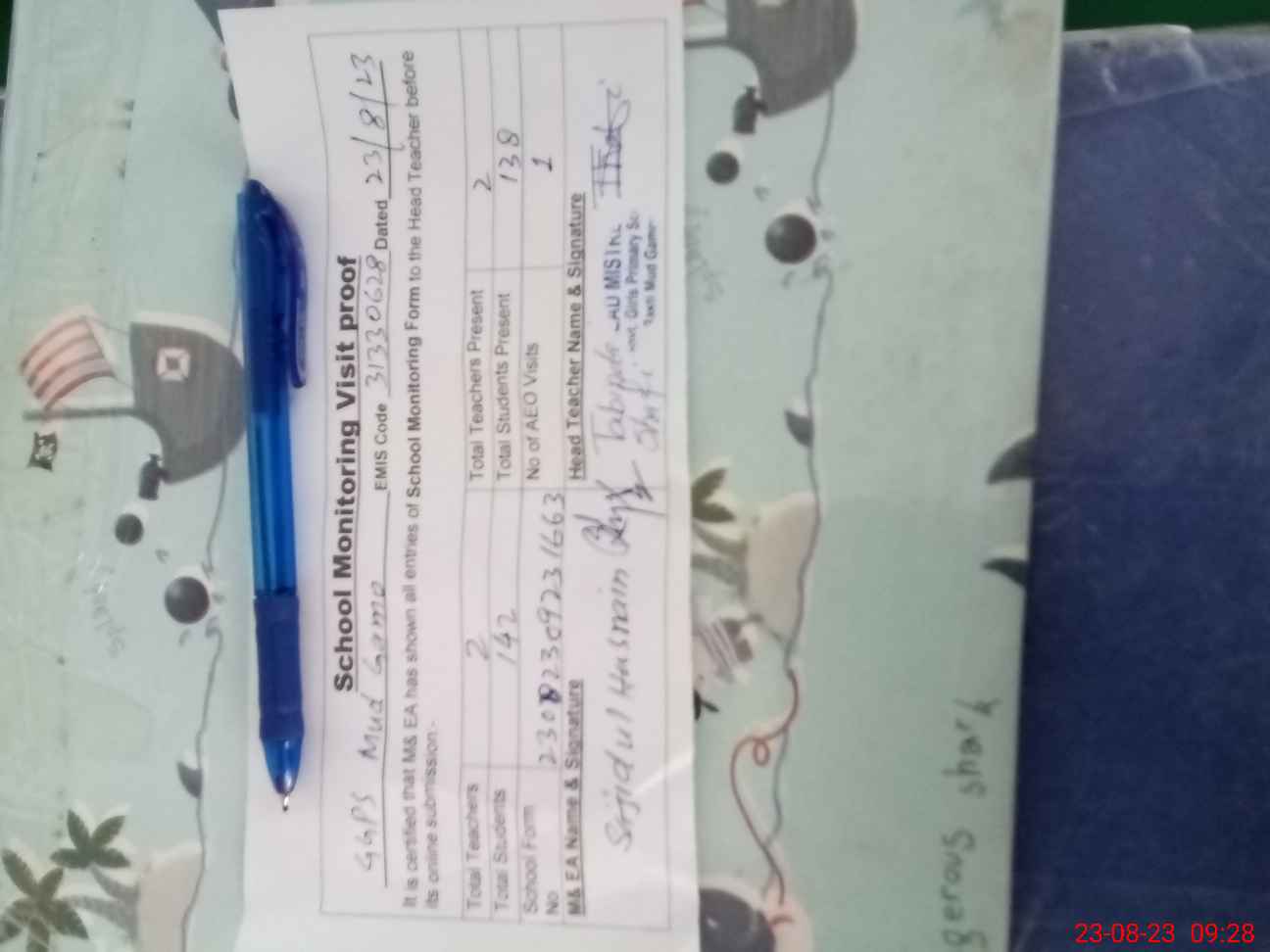 | Attendance Register | Head Teacher | MEA with School | Visit Proof |
