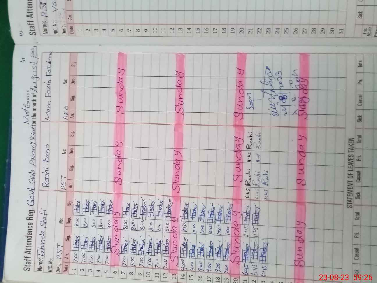 | CNIC | Full Name | Designation | R/C | Absence During Last Calender Month |